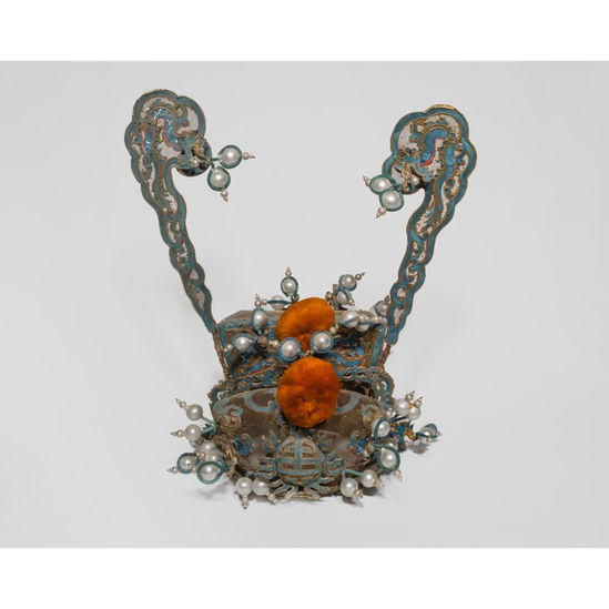 A costume headwear known as a Kuitou that was used in traditional Peking opera plays. The costume design mimics the elaborate headpieces of the Qing Dynasty, incorporating several moving parts, mimicking kingfisher feather Tian-Tsui through the application of cut and glued pieces of turquoise-blue satin and paper. The whole piece follows a motif of dragons chasing pearls while the front bears a depiction of a flaming round Shu (Longevity) character.
