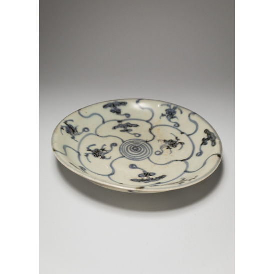 Blue and white lotus dish decorated with painted lingzhi mushrooms and flower bouquets arranged in petal designs that was retrieved from the Tek Sing shipwreck.
