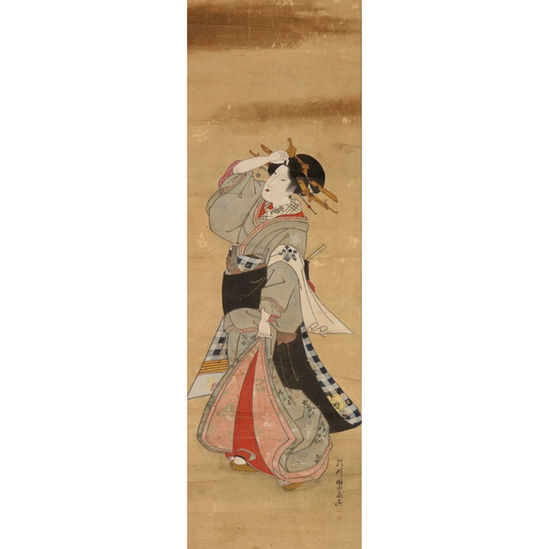 A geisha looks upward while covering her face from the dark storm clouds above. In stride, the woman's posture and sandaled feet suggest that she is en-route to an engagement with customers. She grasps the ends of her kimono revealing a lining decorated with pond weeds. Her fashionable plaid-patterned obi is embroidered with a gold floral design. Plaid patterns were trendy in Edo Japan and were used for both men's and women's clothing.