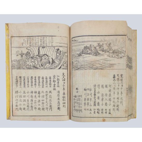 The Eternal, Inexhaustible and Complete Storehouse for Occasional Use of Great Japan (Dai Nihon Eitai Setsuyo Mujinzo) was one of the most common Japanese-Kanji-word dictionaries and household encyclopaedias of the 19th century. Originally compiled by Kawabe Sōyō and first published in 1750, the text was later revised and expanded by Hori Gennyūsai and Hori Genpo in 1831, with subsequent reissued in 1849 and 1864. This example comes from the 1864 version.