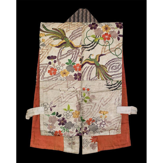 This vest is crafted from joined pieces of cotton and silk, with side straps connecting the front and back panels. The fabric used for both panels features hand-embroidered azure-winged magpies, known as 尾長 ("onaga") in Japanese, which translates as "long tail". In Mandarin, the word for magpie is 喜鵲 ("xǐque"), which includes a character meaning "joyful", reflecting the belief that these birds bring good fortune. The fabric likely originates from a kosode, a style of kimono traditionally worn by young unmarried women.