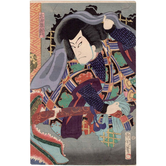 The actors Sawamura Tanosuke III as Wakana-hime, Seki Sanjûrô III as Kusunoki Ôna Rôju and Shikan Nakamura IV as Genkai Nadaemon from the series Modern Tales of the Underworld (Imayô shiranami zukushi).