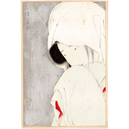 Tsunetomi captures the first scene, where the heron battles against the swirling snow. The print uses heavy application of gofun and silver mica powder across the background and maiden’s clothing to convey the snowfall.