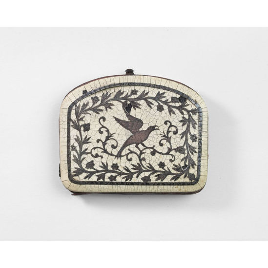 A coin purse with inlaid mother-of-pearl making up the design of a bird perched on a tree bordered by foliage.