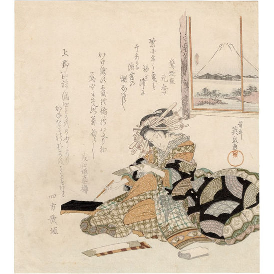 A surimono depicting a high-ranking courtesan preparing to inscribe a poem slip with accompanying poems by Takanoya Motosue, Miwagaki Mataru and Yomo Utagaki, commissioned by the Yomo Poetry Group (Yomogawa Kasumi-ren haru no kusaki no uchi).