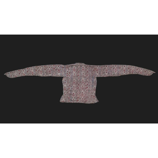 A woman's block-printed cotton short jacket from Iran's Qajar dynasty. The jacket features long, tapered end sleeves with cut undersides that can be fastened using a series of gilt metal buttons.