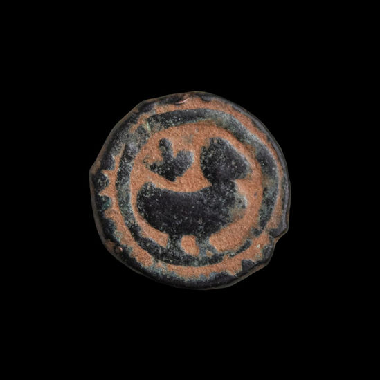 Bronze fals coin struck in Syria by Mamluk Sultan Qaitbay (reign 1468-1496 CE). The coin features a circle containing a standing duck looking to the right with a flower bud or fleur de lis to its left.